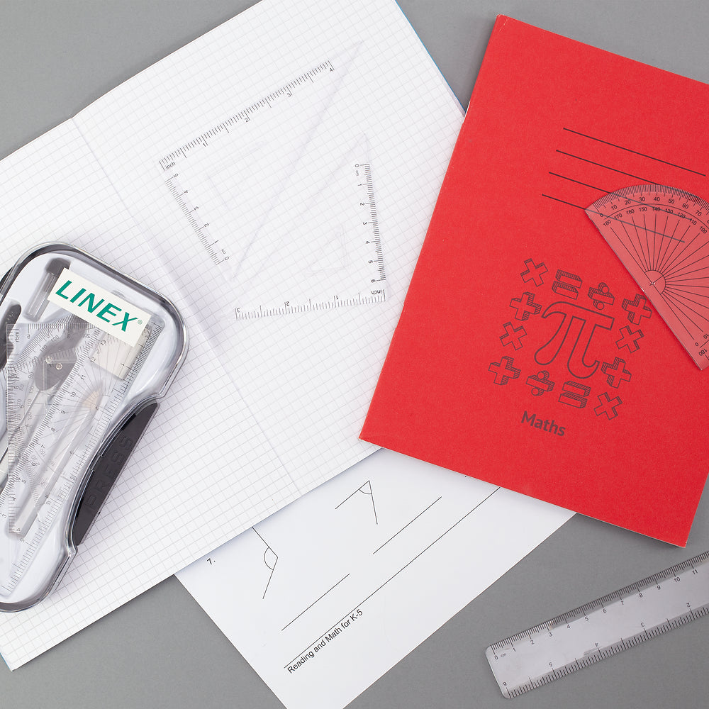 Clear ruler, protractor and set squares enable visibility of work on the page