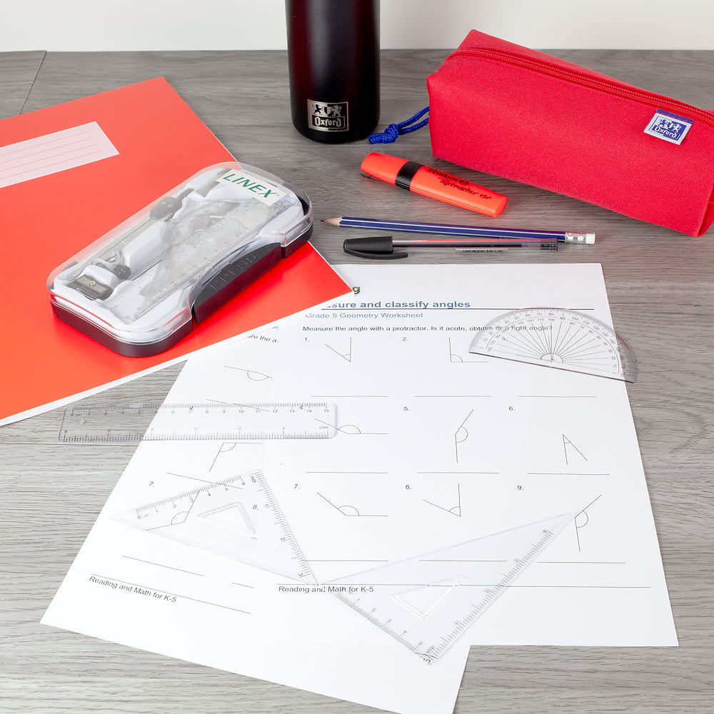 Our 10 piece geometry set is the perfect companion for school maths lessons. The case contains 2 self centering compasses, a pencil, replacement lead refills, a 15cm ruler, protractor, 2 set squares, eraser and sharpener. The compact case is ideal for transporting the set between home and school.