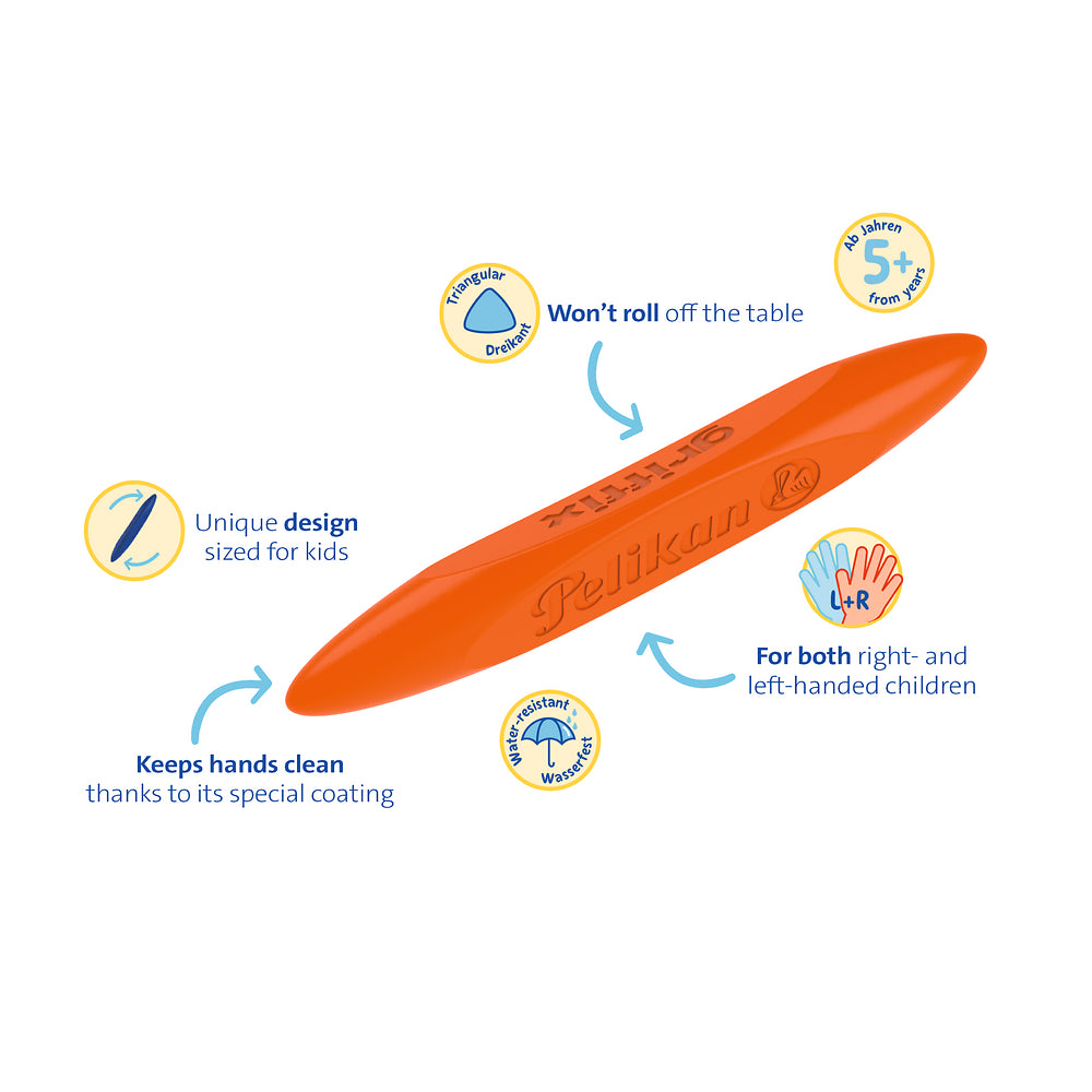 Pelikan Griffix wax crayons have been specially designed for children's hands. The ergonomic triangular shape and the length of the crayons are tailored to children's hands, supporting the development of fine motor skills. Featuring 8 bright and vibrant colours, the Griffix crayons are waterproof and do not smudge. These Pelikan crayons represent the first stage of the Griffix writing learning system. This system has been developed in cooperation with experts to support the writing learning process from the very beginning, as learning to write starts with drawing. The Griffix wax crayons are therefore suitable for both aspiring left- and right-handers.